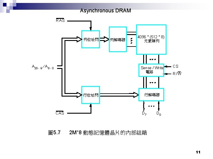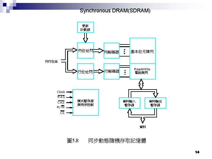 Fast Page Mode conventional DRAM requires that a row and column be sent for each access n FPM works by sending the row address just once for many accesses to memory in locations near each other, improving access time. That is Row address is decoded once with varied Column address decoded to access different bytes on the same row. (見page 5 -54範例5. 1) n 12