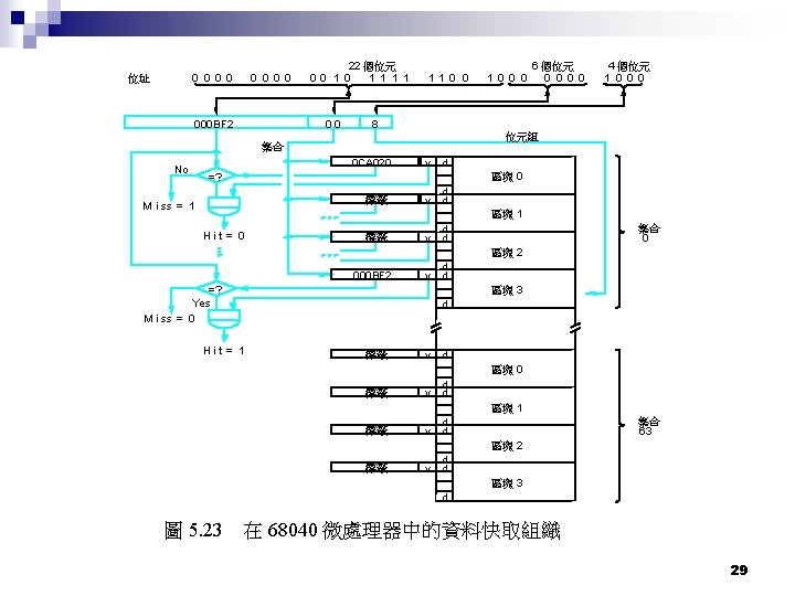 68040 cache n n 4 K Data cache 4 K Instruction cache Contains 64 set Every set contains 4 blocks ¨ 4 -way n n n associative mapping 1 cache block contains 4 long words 1 valid bit for cache block 1 dirty bit for long word Write-back/write-through Random replacement 28