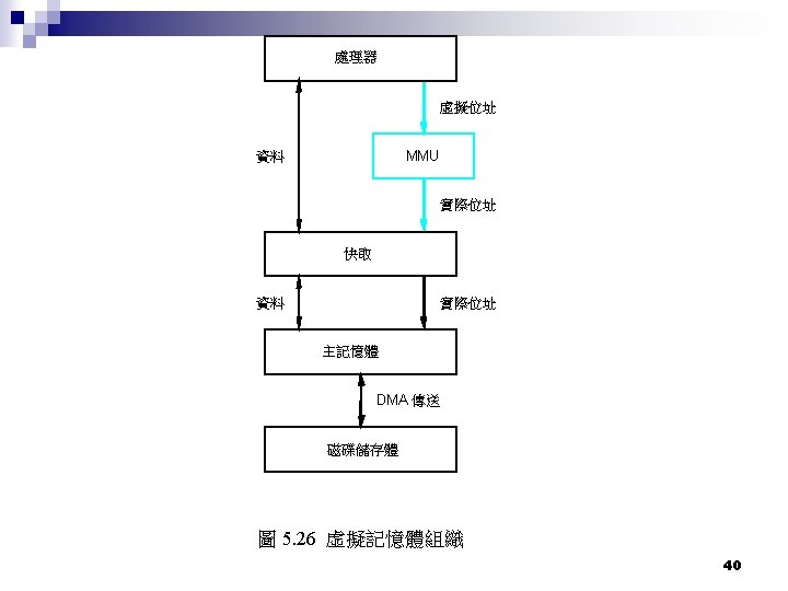 Virtual memory n n n n Virtual address (logical address) MMU (built in CPU) Physical address Page table (in Main Memory) Page frame Address translation TLB ¨ n n Cache built within CPU for holding translated address just used Page fault Replacement algorithm ¨ LRU 39