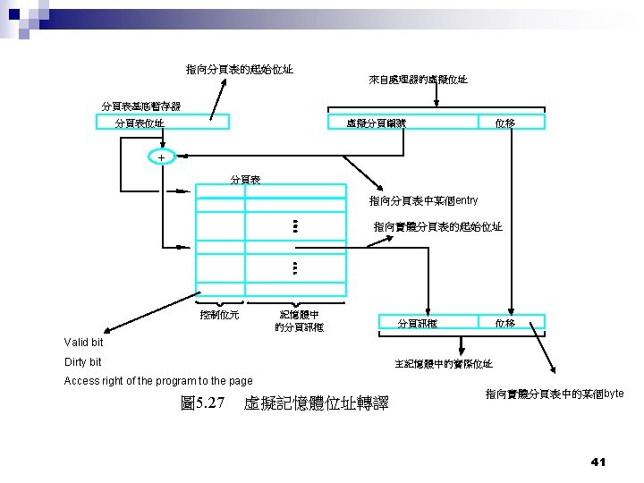 Set associative mapping (集合關聯映射) 主記憶體 Block 0 Block 1 快取 Set 0 Set 1 Set 63 tag tag tag Block 0 Block 63 Block 1 Block 64 Block 2 Block 65 Block 3 Block 127 Block 126 Block 128 Block 127 Block 129 Block 4095 T 標籤 6 圖 5. 17 集合 6 字組 4 主記憶體位址 每個集合有2個區塊的集合關聯式映射快取 26