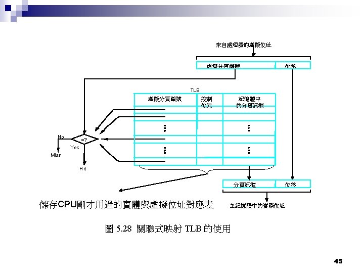 • Direct mapping(直接映射) 主記憶體 Block 0 Block 1 tag 快取 Block 127 Block 0 Block 128 tag Block 129 tag Block 127 Block 255 Block 256 Block 257 Block 4095 標籤 5 區塊 7 字組 4 圖 5. 15 主記憶體位址 直接映射的快取 24