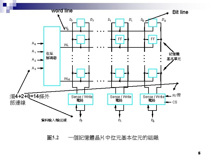 Access time vs cycle time n Memory access time ¨ n Memory cycle time ¨ n n A measurement of how quickly two back-to-back accesses of a memory chip can be made Cycle time > access time due to latency between successive memory accesses DRAM (For construct Main memory) ¨ ¨ n A measurement of single access time - 50 to 150 nanoseconds require a pause (refresh) between back-to-back accesses SRAM (For construct Cache memory) ¨ ¨ access time - 10 nanoseconds no pause between back-to-back accesses 4