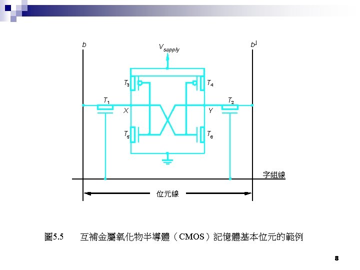 SRAM n SRAM ¨ Static Random Access Memory ¨ Read/write very fast ¨ Needs 6 transistors thus high cost and needs more area ¨ Do not need to refresh ¨ Low power consumption ¨ Implementation technology n CMOS ¨ Construct cache memory 7