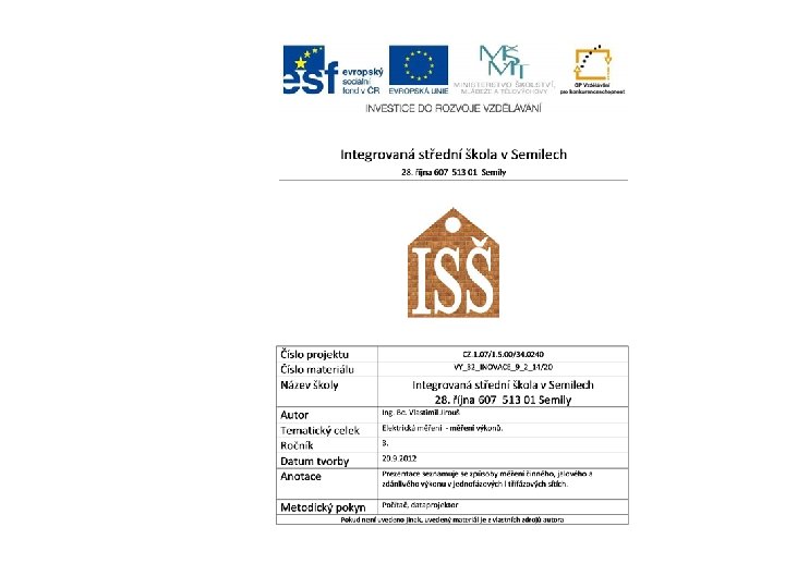 Měření zdánlivého výkonu střídavého proudu • Voltmetrem a ampérmetrem – Schéma zapojení S = U. I Jednotka voltampér