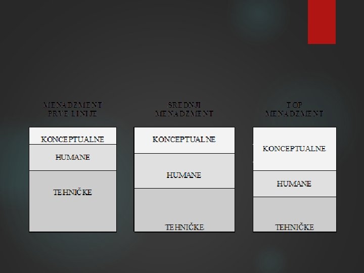 Nivoi menadžera VELIKE ORGANIZACIJE IMAJU TRI NIVOA MENADŽERA: / MENADŽERE PRVE LINIJE, /SREDNJE MENADŽERE /TOP MENADŽERE (NA VRHU). VEĆINA ORGANIZACIJA IMA VIŠE MENADŽERA PRVE LINIJE NEGO MENADŽERA NA VRHU. MENADŽERI NA RAZLIČITIM NIVOIMA IMAJU RAZLIČITE DUŽNOSTI I ZATO SU IM POTREBNE RAZLIČITE VEŠTINE. .