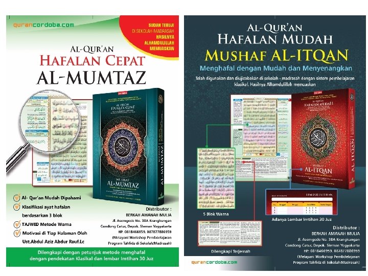 Pilihan Mushaf Hafalan… • Alqur’an Almahira terbitan almahira (Kertas standar, 2 warna, tanpa petunjuk tajwid, tiap awal ayat dibedakan warna), harga 85 K • Alqur’an Tikrar (dh. Al Mustamir) terbitan Syaamil quran (Kertas standar, tulisan agak kecil/tipis, 2 warna, tanpa petunjuk tajwid, tiap halaman dibagi 4 blok), harga 79 K • Alqur’an Al Mumtaz & Al Itqan terbitan Cordoba (Al Qur’an paper, Rasm Usmani, tulisan lebih jelas & lebih besar, Fullcolour, Tajwid warna, tiap halaman dibagi 3 dan 5 blok berwarna), harga 78 K (Al Mumtaz) dan 110 K (Al Itqan, plus terjemahannya)