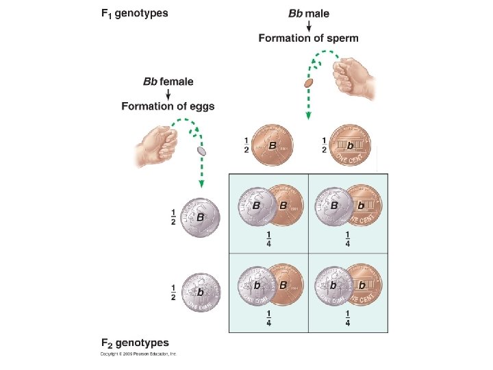 Addition Rule • In an F 2 generation, a heterozygous individual has two possibilities: Ff or f. F, depending on who the recessive allele comes from • The probability that any ONE of two or more mutually exclusive events will occur is calculated by adding together their individual probabilities • Probability of an F 2 heterozygote having a dominant allele from the dad is ¼, and the from the mom is ¼. – Probability of getting an F 2 heterozygote is ¼ + ¼ = ½