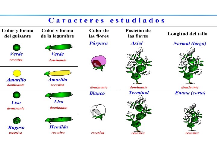 PRIMER GRUPO DE EXPERIMENTOS Mendel comenzó estudiando la transmisión de un único carácter entre la generación parental (P) y sus descendientes (primera generación filial o F 1) La descendencia fueron plantas híbridas, 100% iguales a sólo uno de los parentales. Aparentemente, el color verde había desaparecido y de los dos caracteres paternos sólo uno aparecía en la F 1. Al carácter que aparecía lo llamó dominante y al que no aparecía lo llamó recesivo