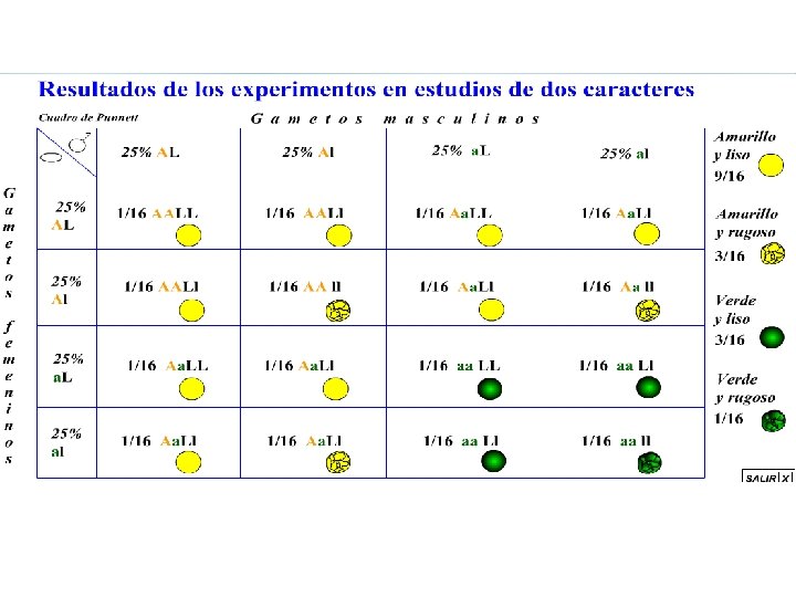Tercera ley de Mendel o ley de la independencia de los caracteres Cuando los parentales forman gametos, al ser líneas puras (homocigotos), cada uno formará un solo tipo de gametos (AB o ab) En la fecundación se formará un solo tipo de dihíbrido (Aa. Bb) con los caracteres observables dominantes y la F 1 será uniforme Cuando los dihíbridos forman gametos, cada uno formará 4 tipos de gametos al separar los alelos y combinarlos de todas las formas posibles. Habrán gametos AB, Ab, a. B y ab (25 % cada clase) F 1 G F 2 En la fecundación, estos gametos de combinan de todas las formas posibles, dando lugar a 4 posibles fenotipos, en la proporción 9: 3: 3: 1 Aparecen nuevas combinaciones de caracteres (amarillorugoso y verde-liso) que no estaban ni en los parentales , ni en la F 1 3ª Ley: Los diferentes alelos se heredan independientemente unos de otros y se combinan al azar en la descendencia