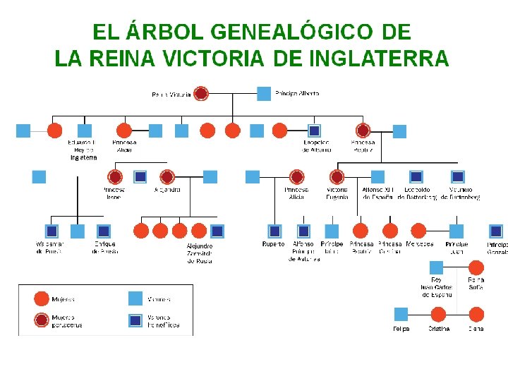 Hemofilia Se caracteriza por la incapacidad de coagular la sangre, debido a la mutación de uno de los factores proteicos (VIII o IX). Se trata de un carácter recesivo localizado en el segmento diferencial del cromosoma X, y afecta fundamentalmente a los varones ya que las posibles mujeres hemofílicas Xh Xh no llegan a nacer, pues esta combinación homocigótica recesiva es letal en el estado embrionario. Los genotipos y fenotipos posibles son: MUJER HOMBRE XHXH: normales XH Y : normal XHXh: normal/portadora Xh Y : hemofílico Xh. Xh: hemofílica (no nace)