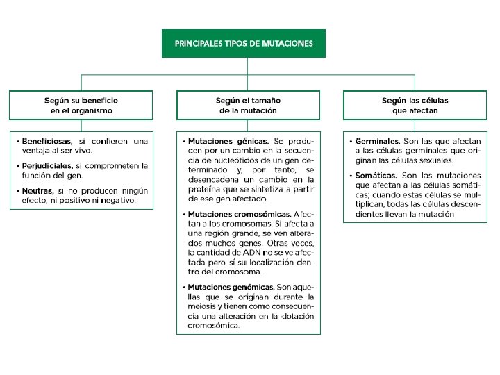 MUTACIONES • Cambios al azar o provocados por agentes mutagénicos en el material genético celular, no dirigidos y de efectos imprevistos. • Algunas mutaciones determinarán una cierta ventaja para la supervivencia de sus portadores; otras darán lugar a alelos equivalentes a los ya existentes, o no tendrán ninguna trascendencia por afectar sólo a fragmentos del ADN no codificante; también pueden existir mutaciones desventajosas, por conllevar una mayor dificultad para sobrevivir, reproducirse e incluso por determinar la muerte de sus portadores.