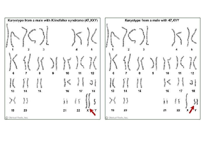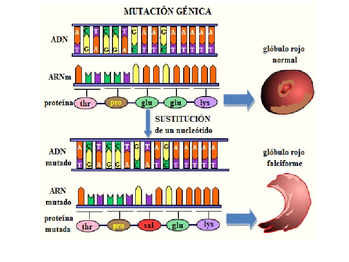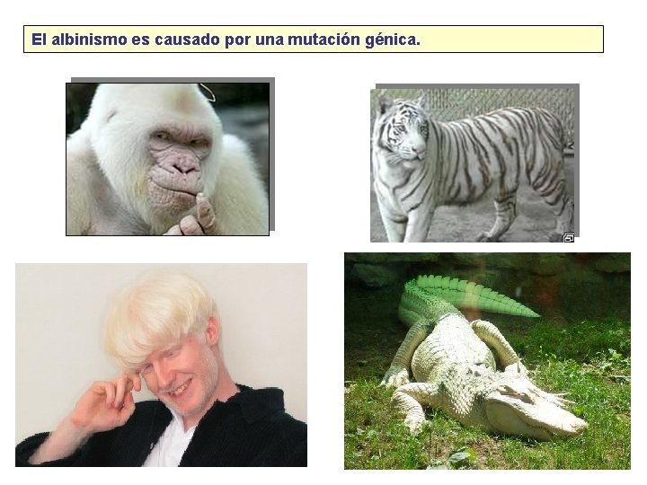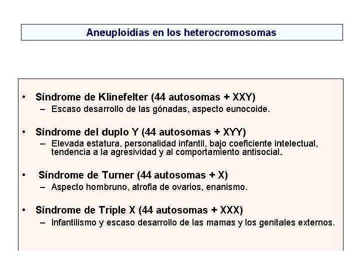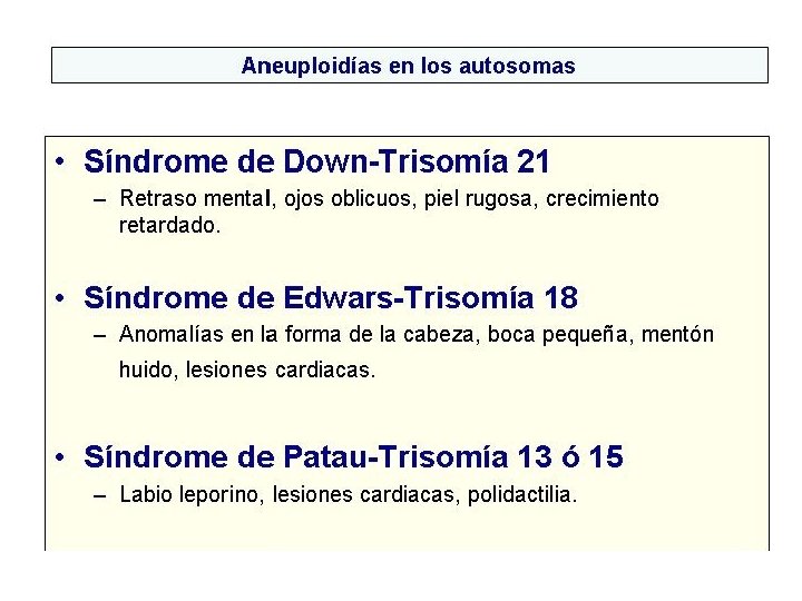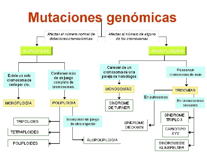 GÉNICAS Albinismo El gen mutado impide que se sintetice el pigmento melanina. Anemia falciforme El gen mutado hace que se sintetice una hemoglobina anómala Fibrosis quística La falta de una enzima hace que se acumule mucus en el aparato respiratorio. CROMOSÓMICAS Síndrome del “maullido del gato” Se origina por la pérdida de un trozo del cromosoma 5. Produce trastornos graves en el crecimiento y retraso mental GENÓMICAS Síndrome de Down Esta repetido un cromosoma de la pareja 21 Síndrome de Klinefelter Tienen un cromosoma X de más. XXY