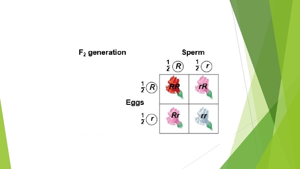 F 1 generation Rr. Yy Sperm 1 4 1 4 1 4 r. Y 1 4 Ry 1 4 ry RY RRYY Rr. YY RRYy Rr. Yy r. Y Rr. YY Eggs 1 4 RY rr. YY Rr. Yy rr. Yy Results: Phenotype 9 16 3 16 Ry RRYy Rr. Yy RRyy rr. Yy Rryy ry Rr. Yy rryy The hypothesis of independent assortment Actual results; hypothesis supported 3 16 1 16 Yellow round Green round Yellow wrinkled Green wrinkled 9: 3: 3: 1