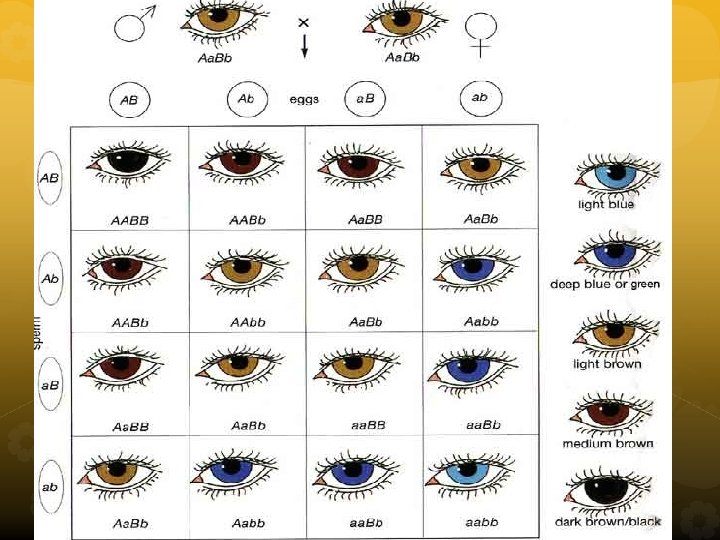 Polygenic Traits • Polygenic traits, or continuous traits, are governed by alleles at two or more loci, • each locus has some influence on the phenotype. • Hair, eye and skin color, height, face shape are polygenic traits • So, several genes influence the outcome of the trait