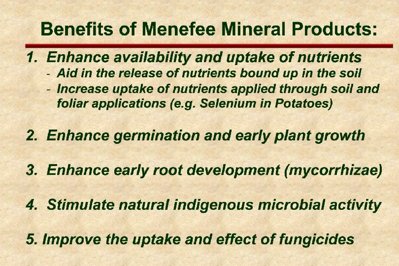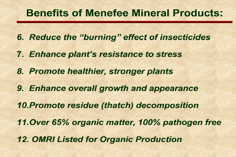 Where Do Humates Come From? v Humates occur in many forms in different parts of the world. Some deposits originated in saltwater, but Menefee Humate is mined from one of the richest deposits of freshwater humates in the world, the Menefee formation located in New Mexico, U. S. A. v Why Is Menefee Humate so Special? v v v Menefee Humate is a pathogen free, totally natural soil conditioner without chemical product, containing virtually no salt, that utilizes prehistoric organic material to stimulate microbial activity and improve the plant’s ability to take in vital nutrients for enhanced growth and development.