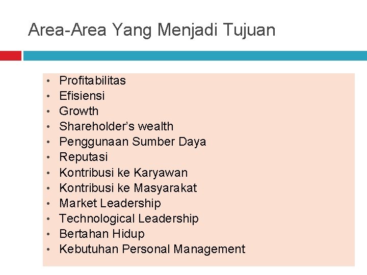 Area-Area Yang Menjadi Tujuan • • • Profitabilitas Efisiensi Growth Shareholder’s wealth Penggunaan Sumber Daya Reputasi Kontribusi ke Karyawan Kontribusi ke Masyarakat Market Leadership Technological Leadership Bertahan Hidup Kebutuhan Personal Management