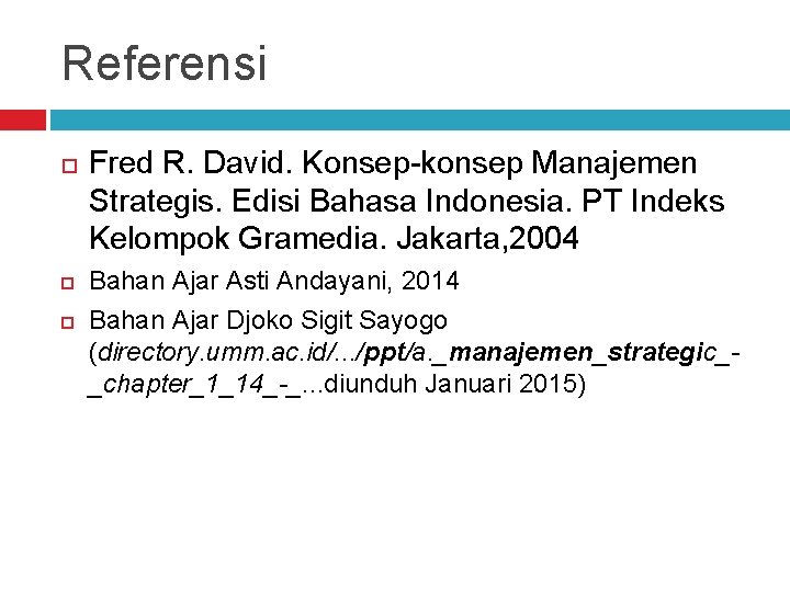 Referensi Fred R. David. Konsep-konsep Manajemen Strategis. Edisi Bahasa Indonesia. PT Indeks Kelompok Gramedia. Jakarta, 2004 Bahan Ajar Asti Andayani, 2014 Bahan Ajar Djoko Sigit Sayogo (directory. umm. ac. id/. . . /ppt/a. _manajemen_strategic__chapter_1_14_-_. . . diunduh Januari 2015)
