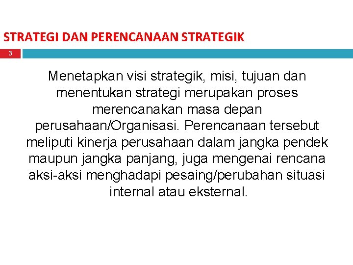 STRATEGI DAN PERENCANAAN STRATEGIK 3 Menetapkan visi strategik, misi, tujuan dan menentukan strategi merupakan proses merencanakan masa depan perusahaan/Organisasi. Perencanaan tersebut meliputi kinerja perusahaan dalam jangka pendek maupun jangka panjang, juga mengenai rencana aksi-aksi menghadapi pesaing/perubahan situasi internal atau eksternal.