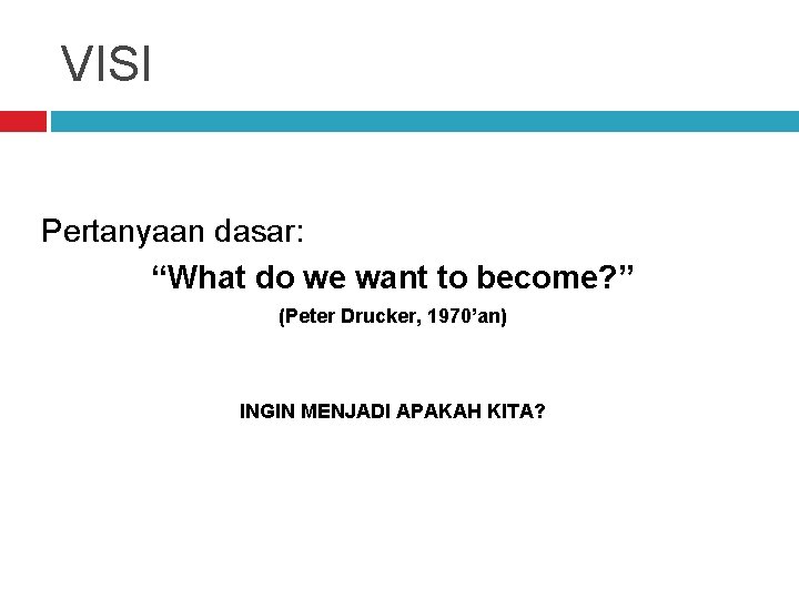 VISI Pertanyaan dasar: “What do we want to become? ” (Peter Drucker, 1970’an) INGIN MENJADI APAKAH KITA?