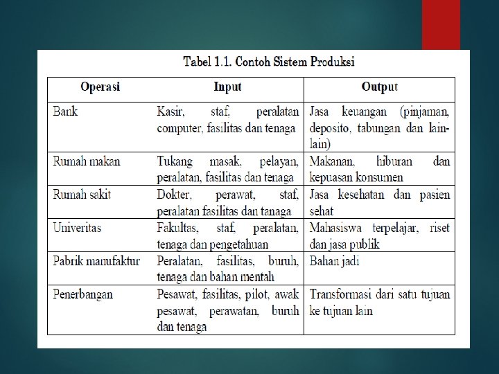 Peran manajer operasi adalah mengawasi system transformasi dan lingkungannya agar dapat merencanakan, mengendalikan dan memperbaiki system. Tabel 1. 1. menunjukkan contoh lain dari system produksi di masyarakat. Dengan mempelajari operasi sebagai system transformasi, banyak hal dapat dipelajari mengenai cara memperbaiki desain operasi dan pengambilan keputusan.