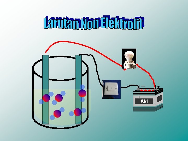 Gelembung gas tidak muncul dan lampu tidak menyala, Berarati larutan tersebut tidak dapat menghantarkan listrik yang disebut larutan non elektrolit Pada larutan non elektrolit, molekulnya tidak terurai menjadi ion (tidak terionisasi) , sehingga tidak ada ion yang bermuatan yang menghantarkan listrik Contoh larutan non elektrolit: larutan gula, urea, alkohol, air murni