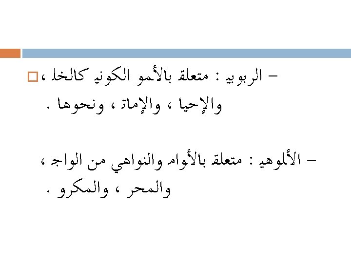 RUBUBIYAH Tauhid Rububiyah adalah mengenal Allah dengan pendekatan alam dan penciptaan, bahwa Allah adalah Pencipta, Pengatur, Pemberi rezeki dan sejenisnya. Terkait dengan menciptakan, mematikan, menghidupkan dan sebagainya. Orang-orang musyrik mengakui ini namun mereka enggan menyembah Allah. Konteksnya ilmu pengetahuan.
