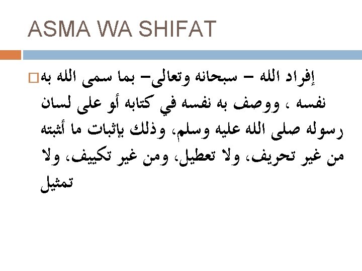 Tauhid Asma wa Shifat Mengesakan Allah dengan nama-nama yang Allah namakan untuk dirinya, atau yang Allah sifatkan dalam kitab-Nya, atau melalui lisan Rasulullah. Dengan cara menetapkan yang telah Allah tetapkan, tanpa Tahrif ( merubah ), Ta’til ( mengganti ), Tamtsil ( menyerupakan )