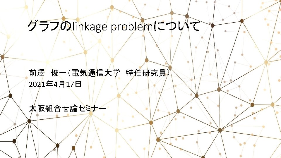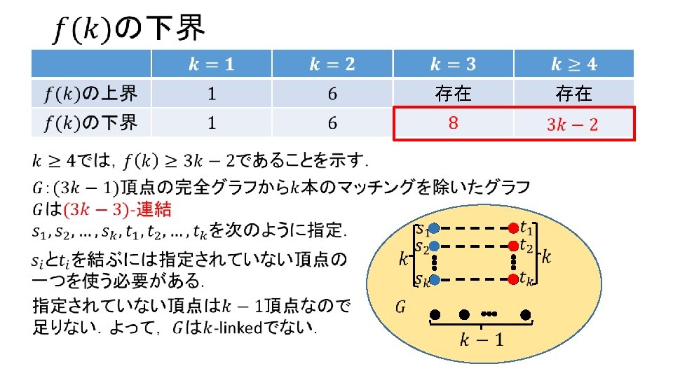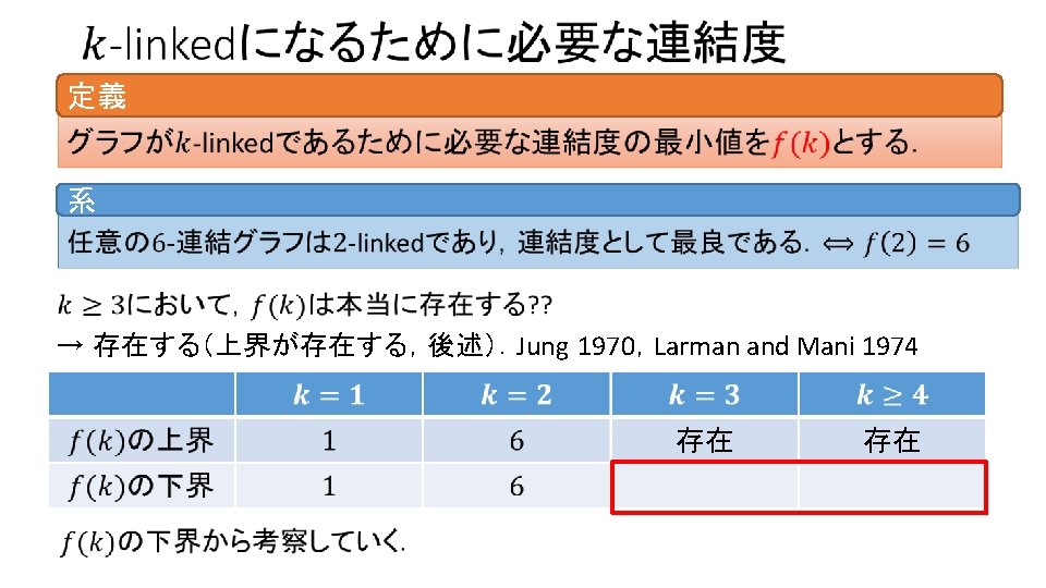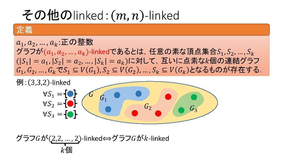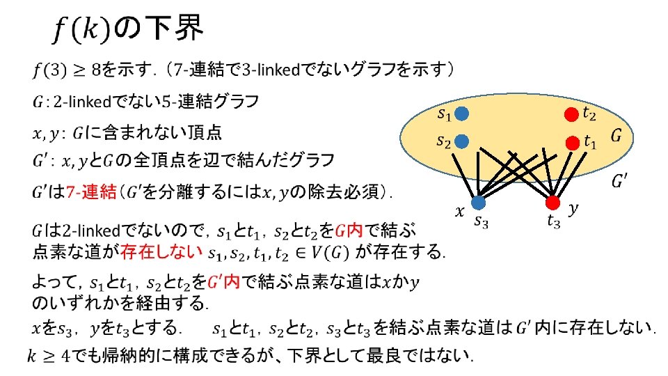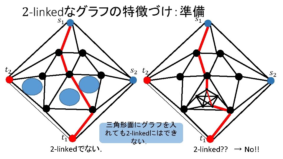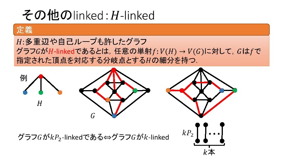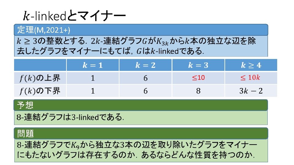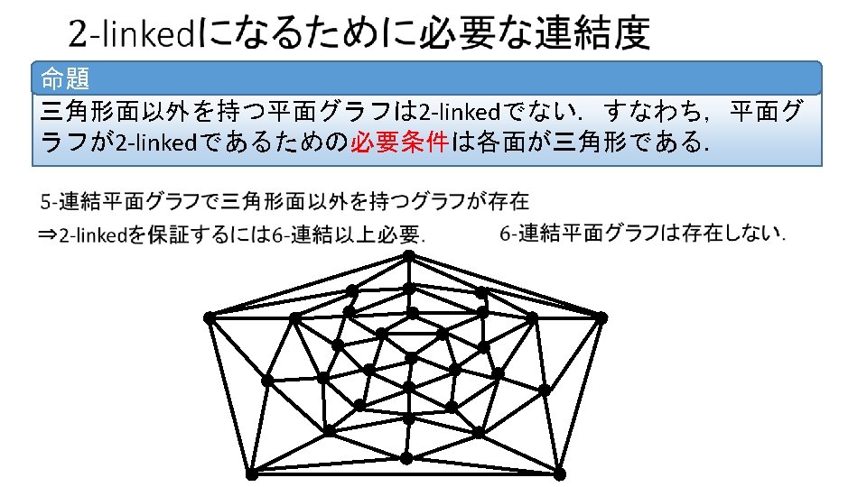 Thomas and Wollan, 2005を利 用 定理(Goddard 2002) 定理(Ellingham, Michael, Plummer, and Yu 2011) 定理(Mc. Carty, Wang, and Yu 2019) 定理(Stephens and Ye 2019+) • 一般のグラフにおける diamond-linkedの連結度は不明 • 5頂点以上のグラフのlinkedを 連結度で保証するのは未解明