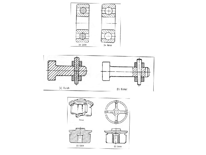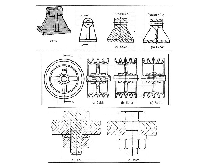 7. Beberapa benda atau bagian benda yang tidak boleh dipotong Benda-benda seperti poros dan pasak, bola pejal, pena tirus, sirip atau rusuk penguat, ruji-ruji roda, paku keling, baut dan cincinnya, tidak boleh di potong dalam arah memanjang.