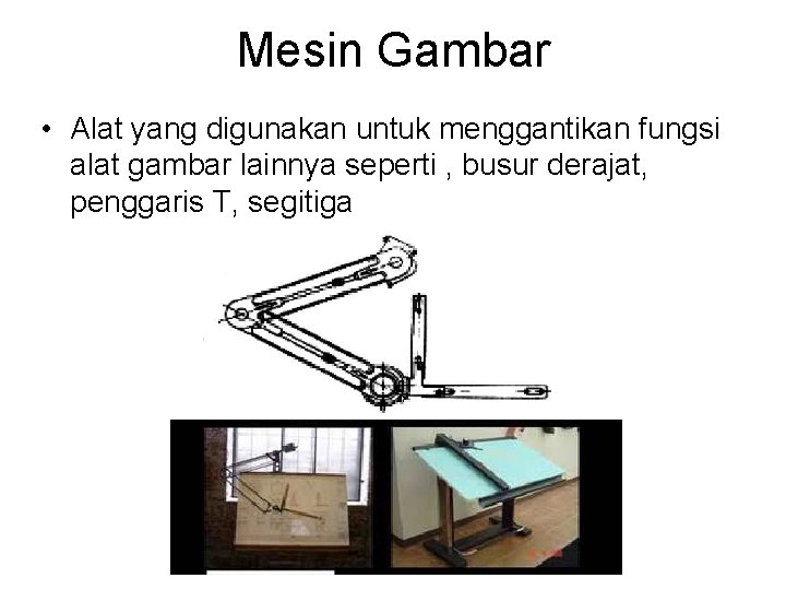 Mesin Gambar • Alat yang digunakan untuk menggantikan fungsi alat gambar lainnya seperti , busur derajat, penggaris T, segitiga