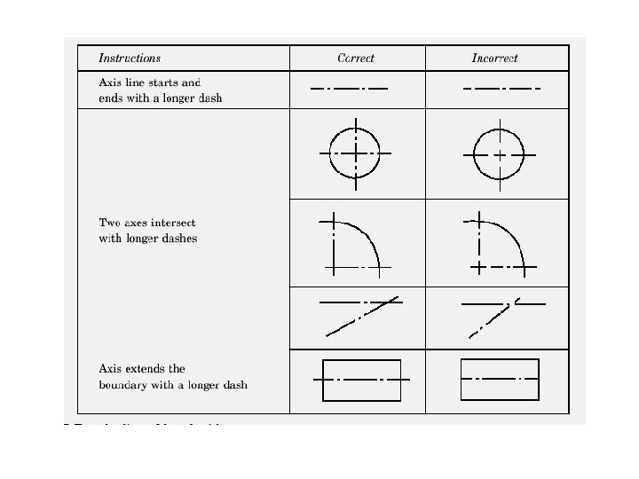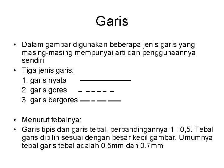 Garis • Dalam gambar digunakan beberapa jenis garis yang masing-masing mempunyai arti dan penggunaannya sendiri • Tiga jenis garis: 1. garis nyata 2. garis gores 3. garis bergores • Menurut tebalnya: • Garis tipis dan garis tebal, perbandingannya 1 : 0, 5. Tebal garis dipilih sesuai dengan besar kecil gambar. Umumnya tebal garis tebal adalah 0. 5 mm dan 0. 7 mm