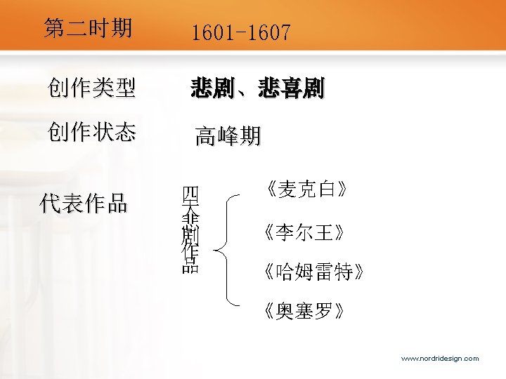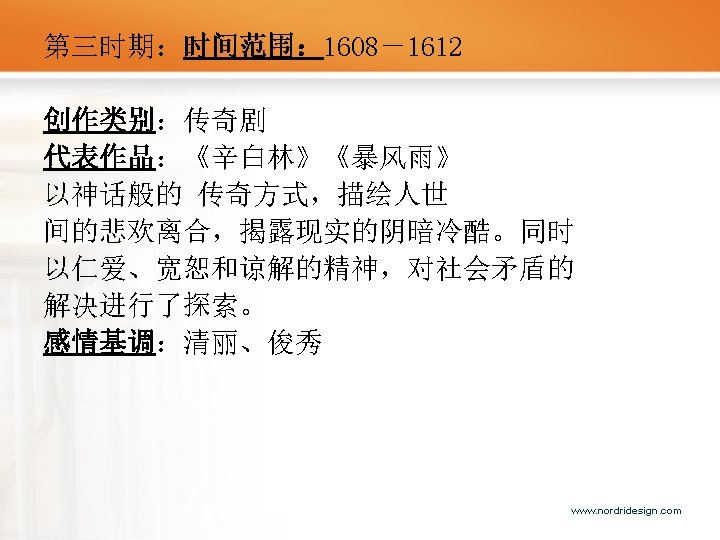 感情基调:乐观、激越、明朗 四 大 喜 剧 作 品 《仲夏夜之梦》 A Midsummer Night‘s Dream 《皆大欢喜》 As You Like It 《第十二夜》 Twelfth Night 《威尼斯商人》 The Merchant of Venice www. nordridesign. com