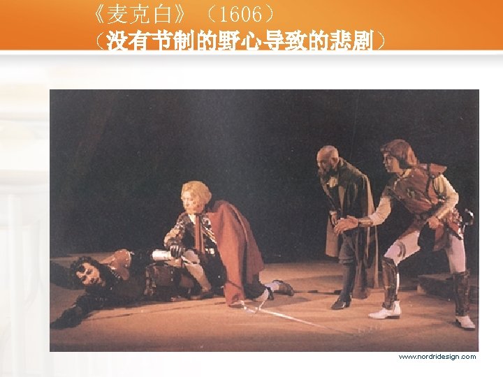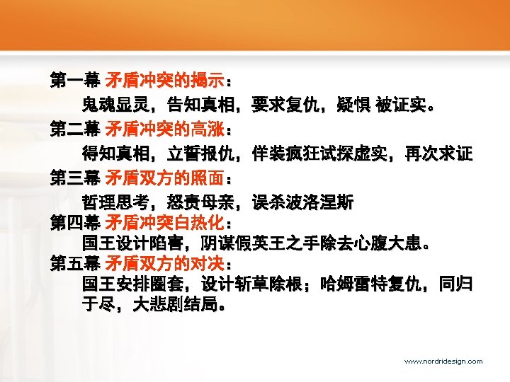 The Plot overview • • • Ghost story Hamlet’s personal relation plight Test of murder story Hamlet’s exile Duel : Laertes vs. Hamlet Final revenge www. nordridesign. com