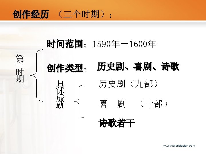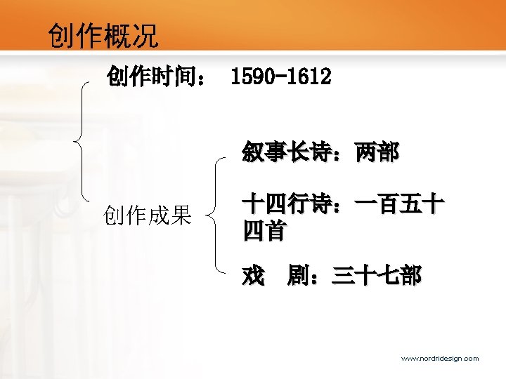 • Born in a businessman family in 1564 • Very little is known about education background • Married to Anne Hathaway(8 years older than him) on November the 28 th, 1582 • Left hometown to London for living (20 years , one visit to hometown) • Began to write plays and poems • Back to hometwon in 1613 • Passed away in 1616 www. nordridesign. com