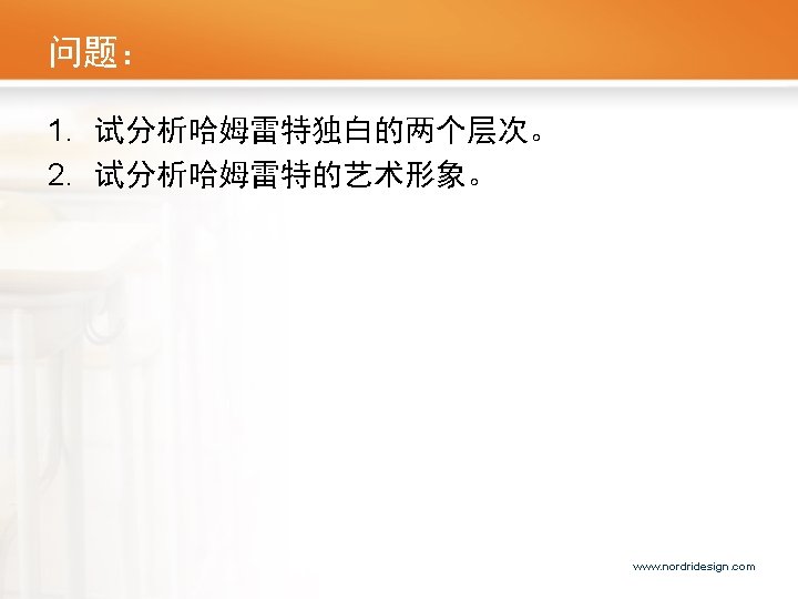 Themes of this soliloquy • this speech connects many of the play’s main themes, including the idea of suicide and death, the difficulty of knowing the truth in a spiritually ambiguous universe, and the connection between thought and action. • In addition to its crucial thematic content, this speech is important for what it reveals about the quality of Hamlet’s mind. His deeply passionate nature is complemented by a relentlessly logical intellect, which works furiously to find a solution to his misery. He has turned to religion and found it inadequate to help him either kill himself or resolve to kill Claudius. Here, he turns to a logical philosophical inquiry and finds it equally frustrating. Back www. nordridesign. com