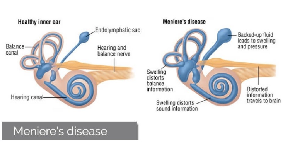 • Acute attacks are superimposed on a gradual deterioration in sensorineural hearing in the involved ear, typically in the low frequencies initially. • Over time, a reduction in responsiveness of the involved peripheral vestibular system occurs.