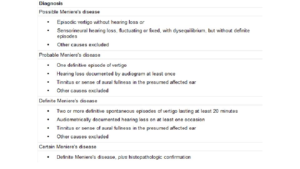 Clinical Presentation • Typical history consists of recurring attacks of -vertigo (96. 2%) -tinnitus (91. 1%) -ipsilateral hearing loss (87. 7%). • Tinnitus >nonpulsatile