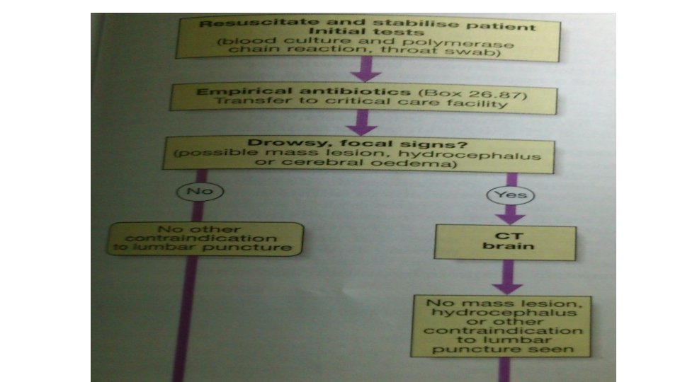 Investigations • CBC & ESR, U&E, LFT, Nasopharyngeal swab, Blood cultures • LP • CXR • CT scan & MRI brain , also for sinuses, otitis media, and other parameningeal source. • EEG • MRV & MRI • Tuberculin test • HIV screen