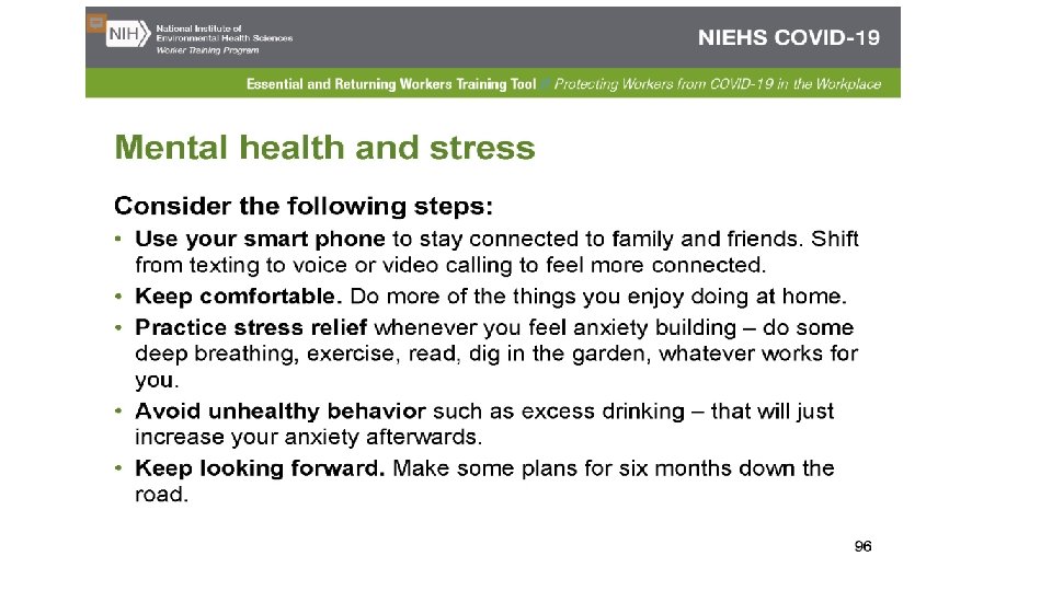 Activity – Caring for yourself Using the Caring For Yourself in the Face of Difficult Work NIH Worksheet, review the five areas of self-care. • How do you rate your health in the four areas of sleeping, eating, exercise, relaxation and social interaction? • Due to COVID-19 restrictions, make a list of things you cannot control that decreases your mental health. • Are there things in your control that you can change to live a healthier lifestyle? • What other things, not listed in the worksheet, can you do to increase your mental health in order to cope with COVID-19?