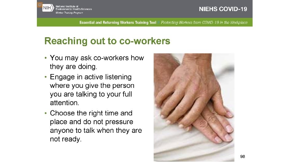 Acknowledgement The Midwest Consortium developed this course under cooperative agreement number U 45 ES 06184 from the National Institute of Environmental Health Sciences for community members who may be impacted by COVID-19. Source: Except as noted, content and images for this Power. Point presentation have been adapted from NIEHS COVID-19 Training Tools: https: //tools. niehs. nih. gov/wetp/covid 19 worker/index. cfm