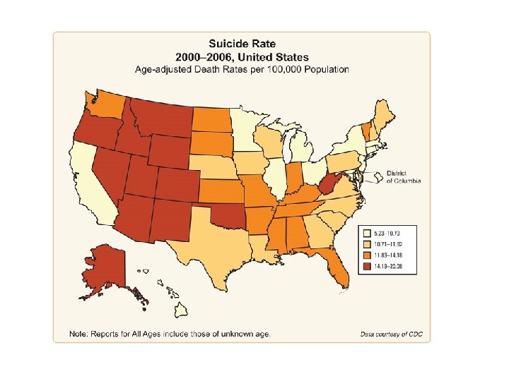 Mental Health and Mental Disorders— A Rural Challenge • Fourth most often identified rural health priority • Suicide rate among rural males and children is higher than among their urban counterparts • Among 1, 253 smaller rural counties with populations of 2, 500 -20, 000 nearly three 0 fourths lack a psychiatrist and 95% lack a child psychiatrist • Suicide, stress, depression and anxiety disorders