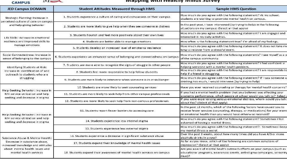 JED Campus Theory of Change: Mapping with Healthy Minds Study JED Campus Domain Student Attitude Measured Via HMS Identifying Students At Risk: Increase in Identification of and outreach to students who are struggling 1. Students are more likely to recognize the signs of struggle in other people 1. How much do you agree with the following statement: I feel confident in helping someone with a MH problem 2. Students feel more responsible to help fellow students 2. How much do you agree with the following statement: I am responsible to help if a friend is struggling 3. Students are more likely to intervene when someone is in crisis/danger 3. How much do you agree with the following statement: If I saw someone drinking too much, I would intervene by trying to help Sample HMS Question