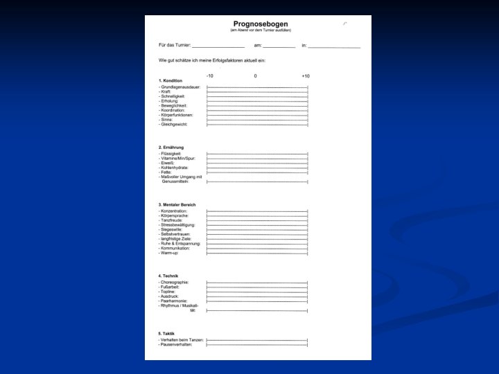 Prognosetraining n Der Sportler soll Vorhersagen über einzelne Komponenten seiner Sportart geben n n „Schätze deine aktuelle Zeit über 30 m fliegend ein“ Ziel muss es sein, die eigene Leistung immer besser einschätzen zu können.