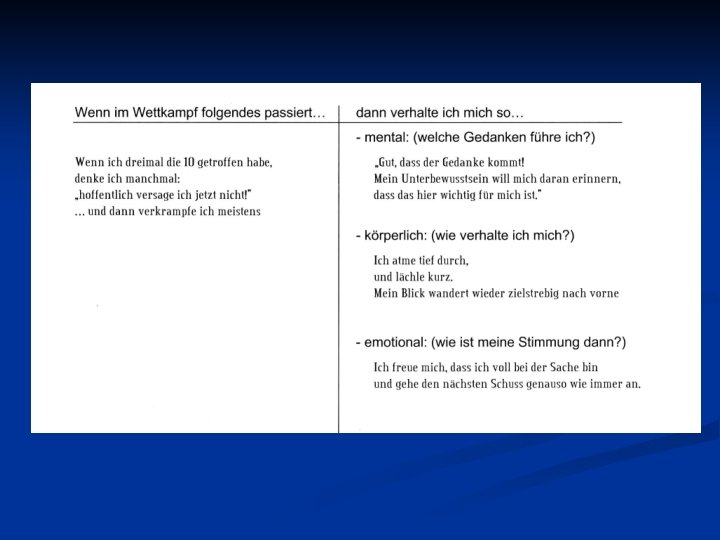 Leistungswahrnehmung n Beginnt mit der Körperwahrnehmung und der Wahrnehmung des Körpergefühls n Wie fühlst du dich jetzt? n Wie fühlst du dich, wenn alles perfekt läuft? n Was denkst du, wenn alles perfekt läuft? n Wie ist deine Körpersprache, wenn alles perfekt läuft? n Woran merkst Du, dass es nicht flüssig läuft? n Wie war es früher, als du so richtig Spaß hattest im Wettkampf? n Wie war es/ist es in anderen Situationen, wo Leistung auf Abruf gefragt ist?