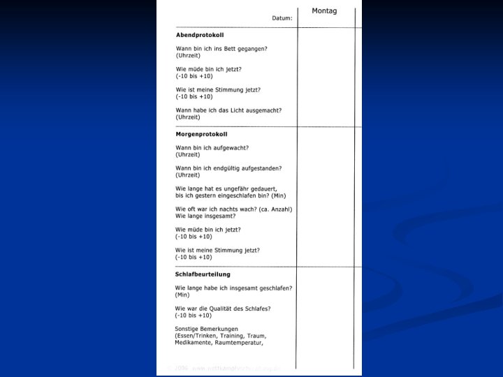 Methoden der Schlafoptimierung Schlafumgebung: etwa 18°C, dunkel, leise n Bett und Bettwäsche n Ritual vor dem Schlafengehen (Gewohnheit, Fernsehen ist nicht effektiv!) n Entspannungsbad mit Zusätzen n Alkohol vermeiden (fördert das Einschalfen, aber verringert Qualität) n Schlaf-Wach-Rhythmus einhalten n Nicht den Schlaf erzwingen Entspannungsrituale n Wärmflasche, Heizdecke n Keine großen Mahlzeiten vor dem Schlafengehen n Kein Koffein ab xx Uhr Schlafhygiene n