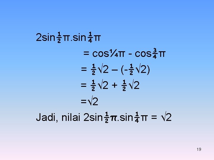 3. Nyatakan bentuk 2 sin½π. sin¼π sebagai bentuk penjumlahan, kemudian tentukan nilainya. Bahasan: 2 sin. sin = cos( - ) - cos( + ) 2 sin½π. sin¼π = cos(½π - ¼π) - cos(½π + ¼π) = cos¼π - cos¾π 18