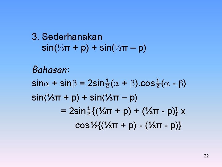 2. Sederhanakan sin 160° + sin 20° Bahasan: sin + sin = 2 sin½( + ). cos½( - ) sin 160° + sin 20° = 2 sin½(160 + 20)°. cos½(160 – 20)° = 2 sin 90°. cos 70° = 2. 1. cos 70° = 2 cos 70° 31