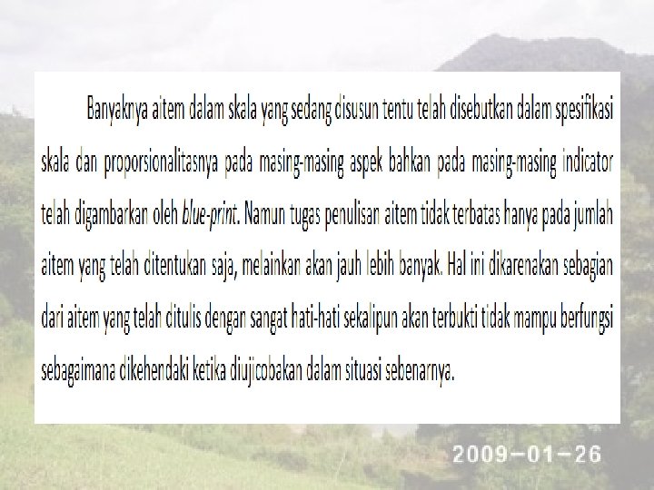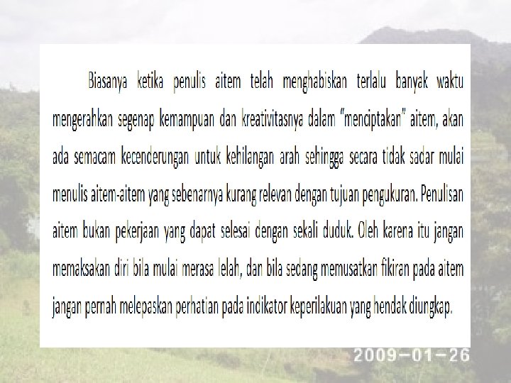 • Gunakan kata dan kalimat yang sederhana, jelas, dan mudah dimengerti oleh responden namun tetap harus mengikuti tata tulis dan tata bahasa Indonesia yang baku. • Tulis aitem dengan berhati-hati sehingga tidak menimbulkan penafsiran ganda terhadap kata dan istilah yang digunakan.