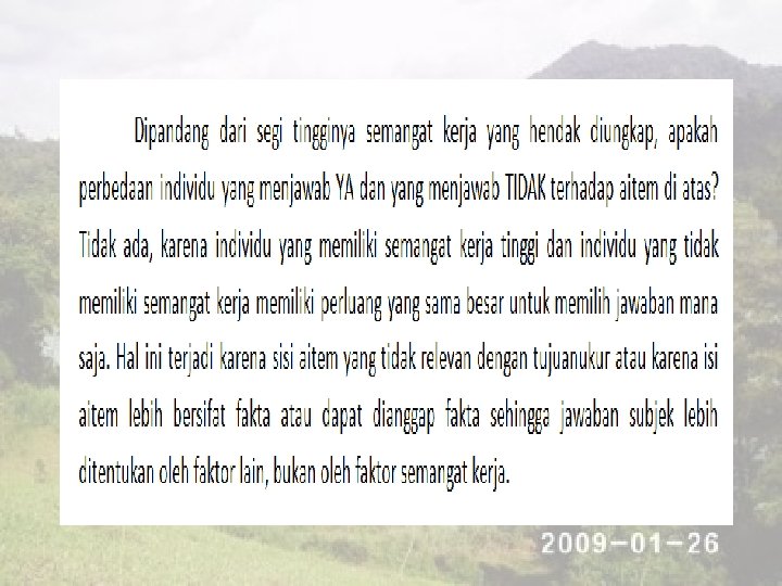 • Problem pada aitem di atas terletak pada makna istilah “pendengar yang baik” yang dapat bersifat favorabel dan dapat pula bersifat tidak favorabel. • Bila yang dimaksudkan sebagai pendengar yang baik adalah seseorang yang dapat menjadi tempat curahan hati dan memahami orang lain dengan penuh empati, tentu aitem tersebut termasuk aitem favorabel.