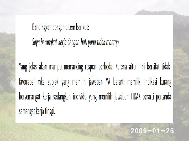 • Untuk menghindari stereotype jawaban, sebagian dari aitem perlu dibuat dalam arah favorable dan sebagian lain dibuat dalam arah tidak favorable.